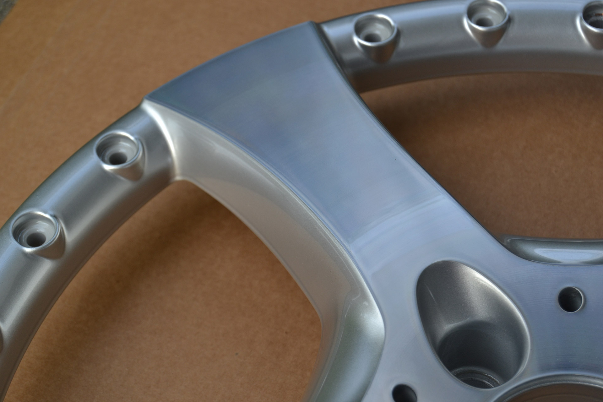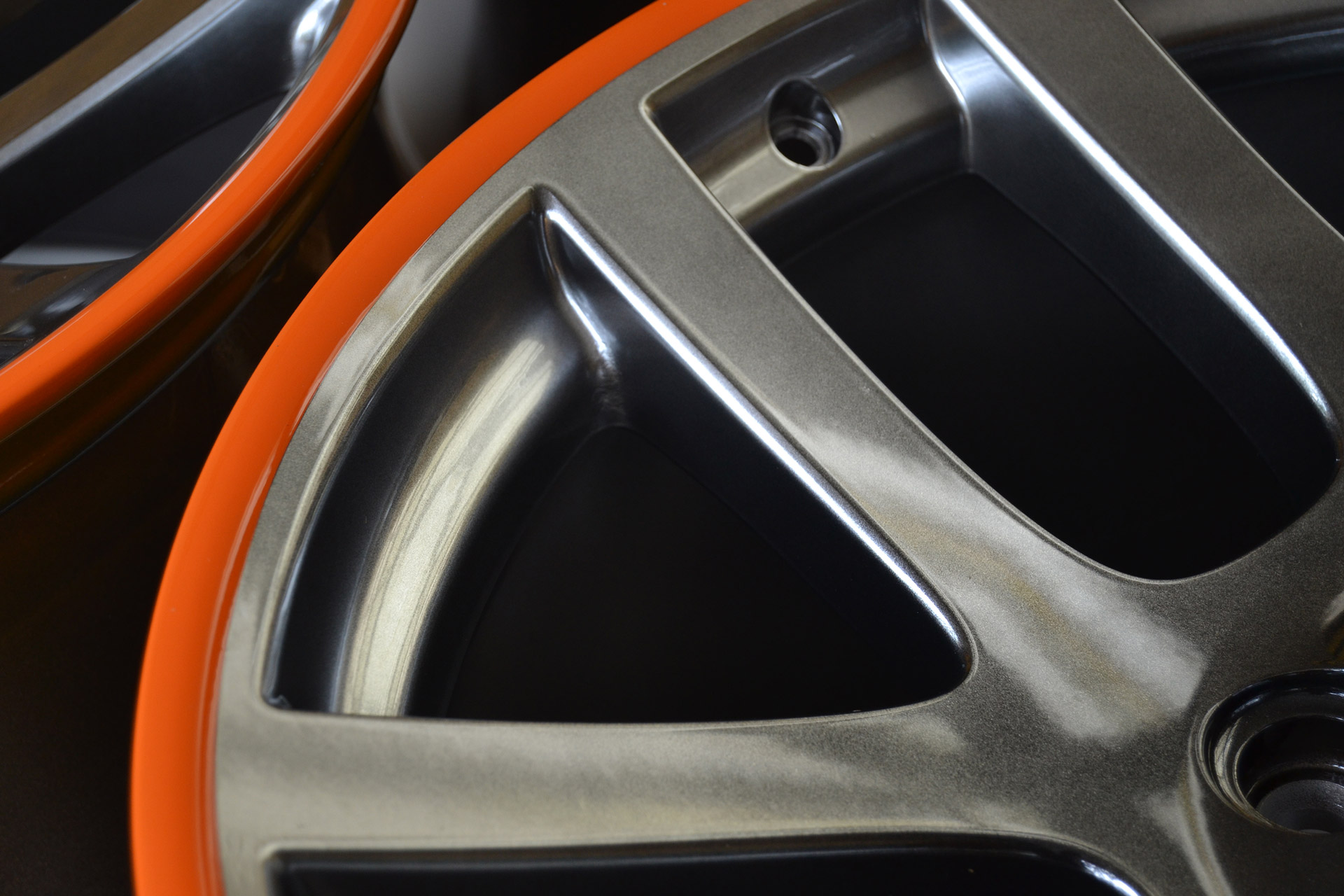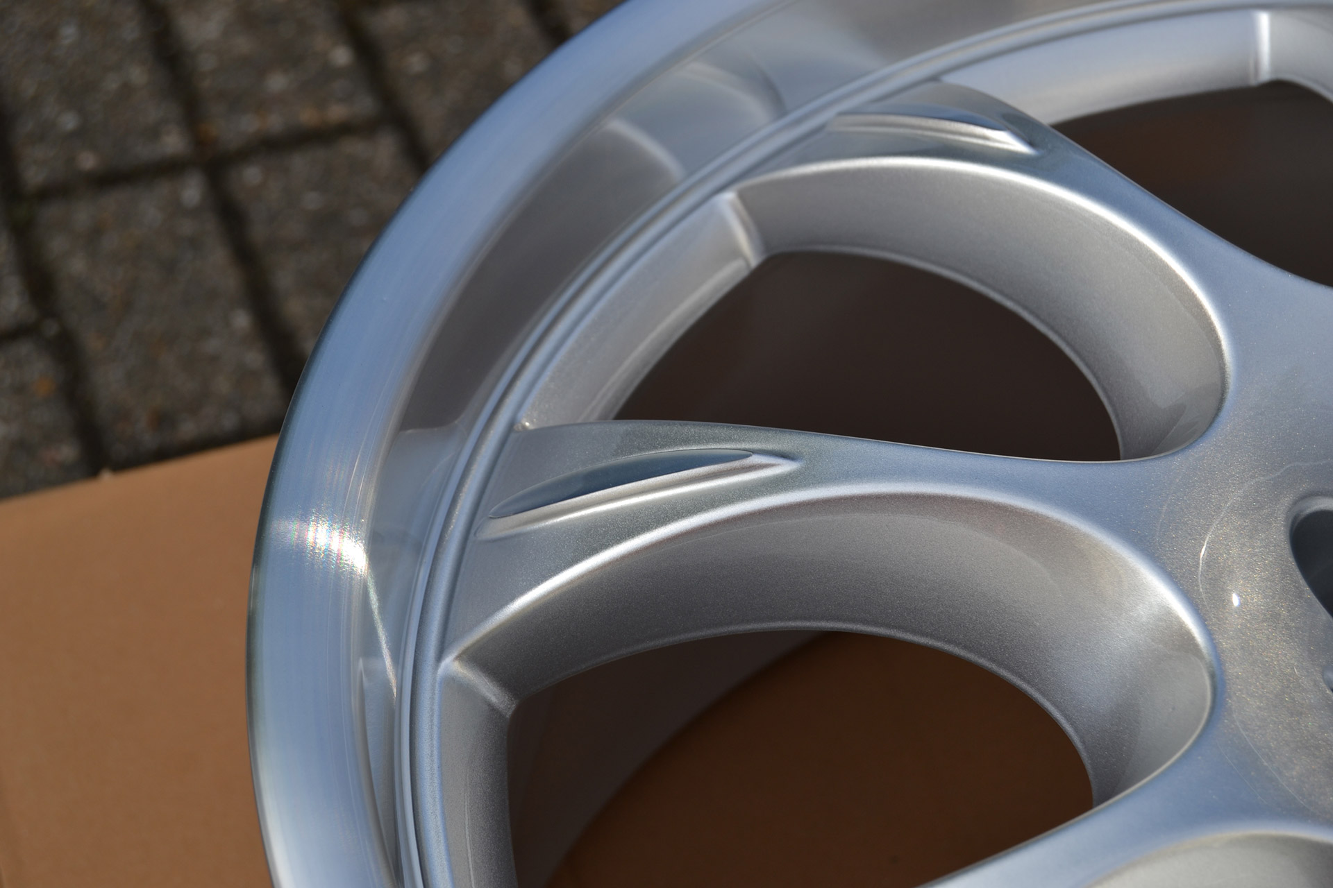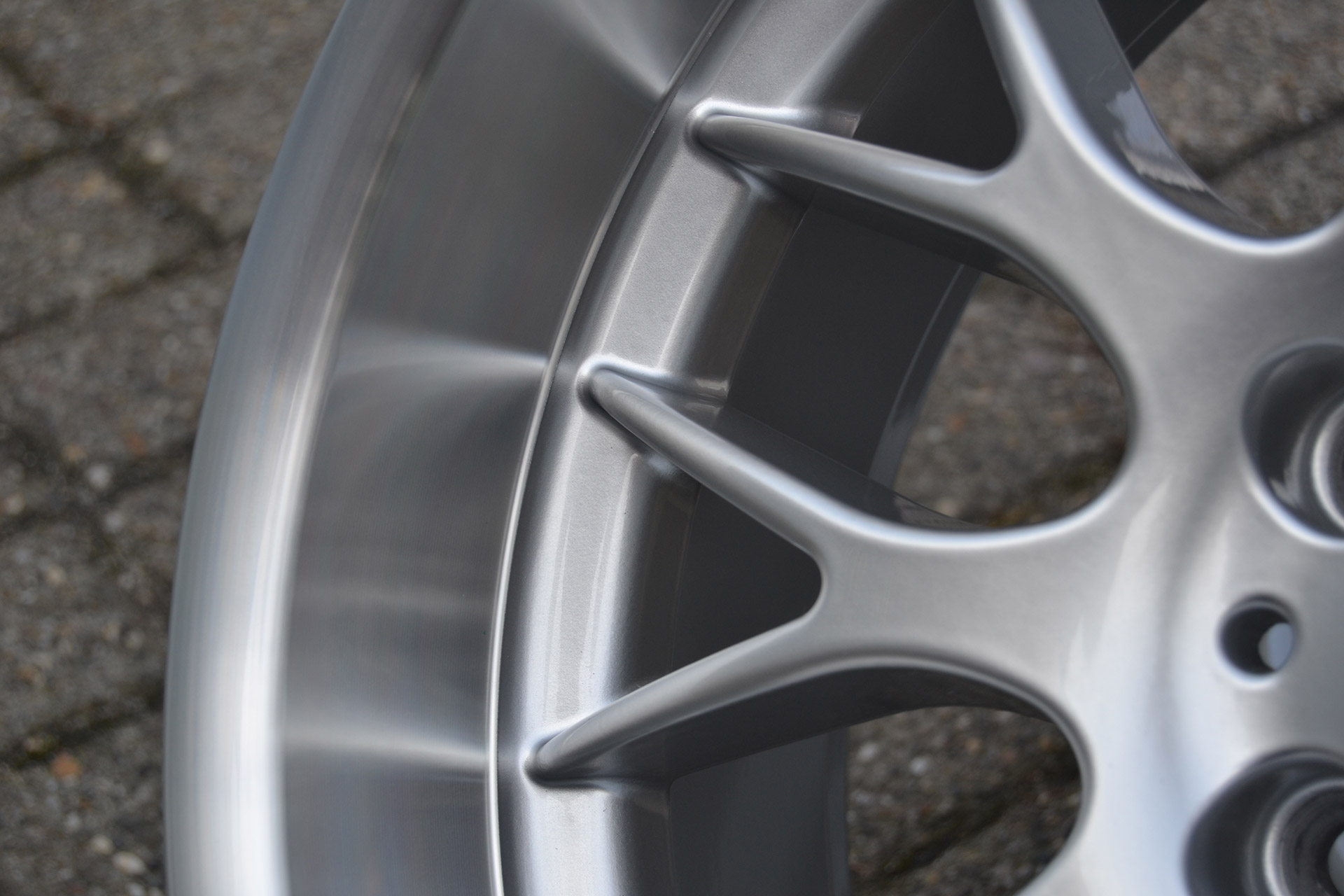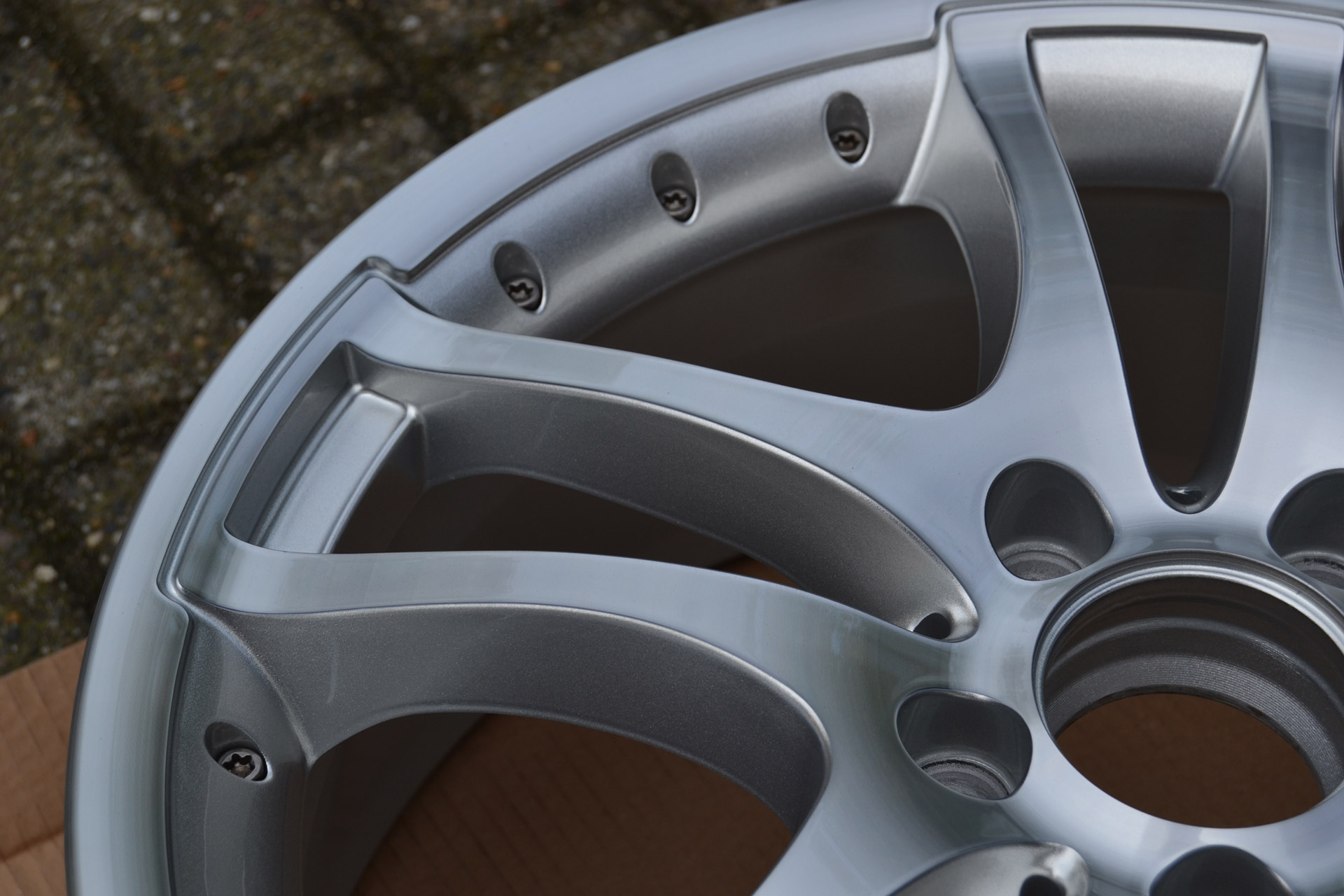 Nach dem Pulverbeschichten können die Teile auf Wunsch an bestimmten Stellen poliert werden und zum Schutz der polierten Flächen ergänzend Klar beschichtet werden (z.B. das Felgenbett wie es auf dem Bild unterhalb zu sehen ist).