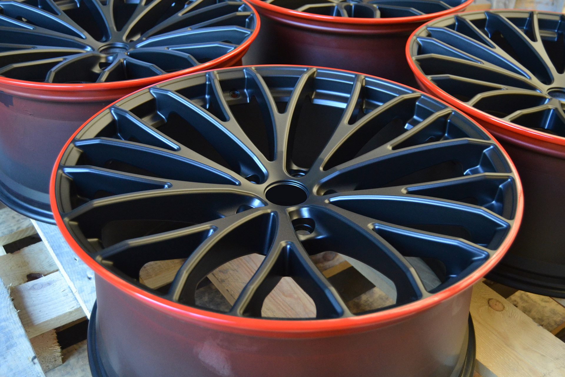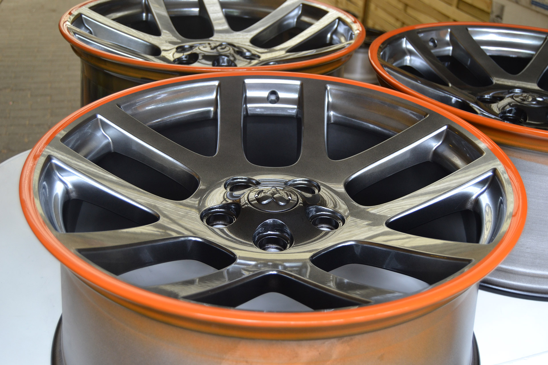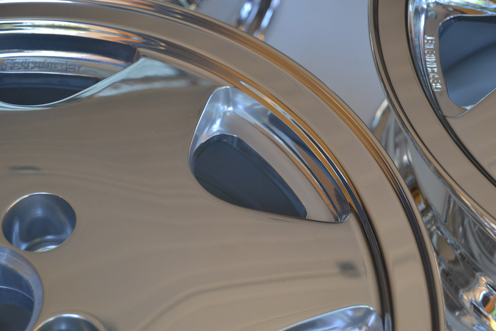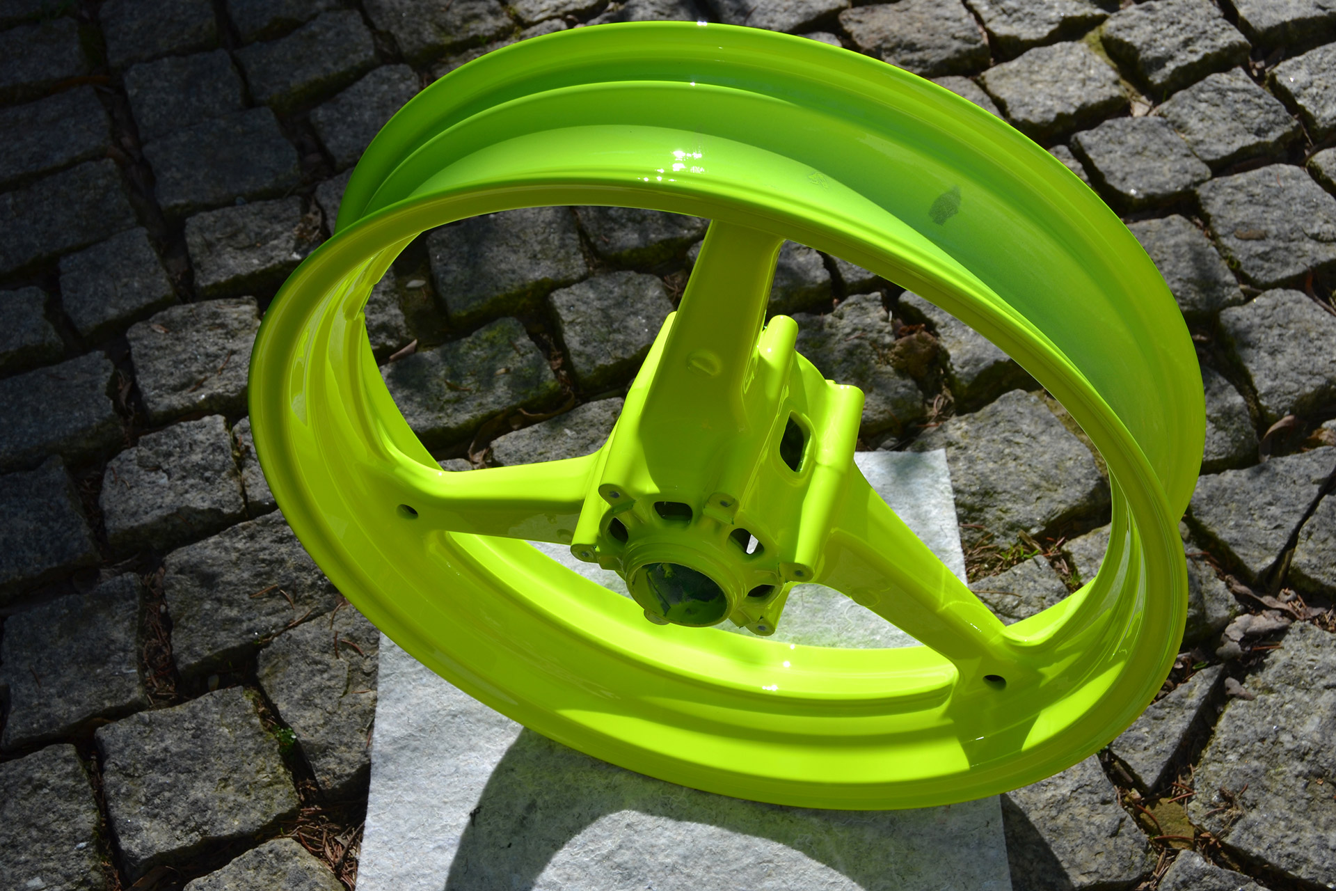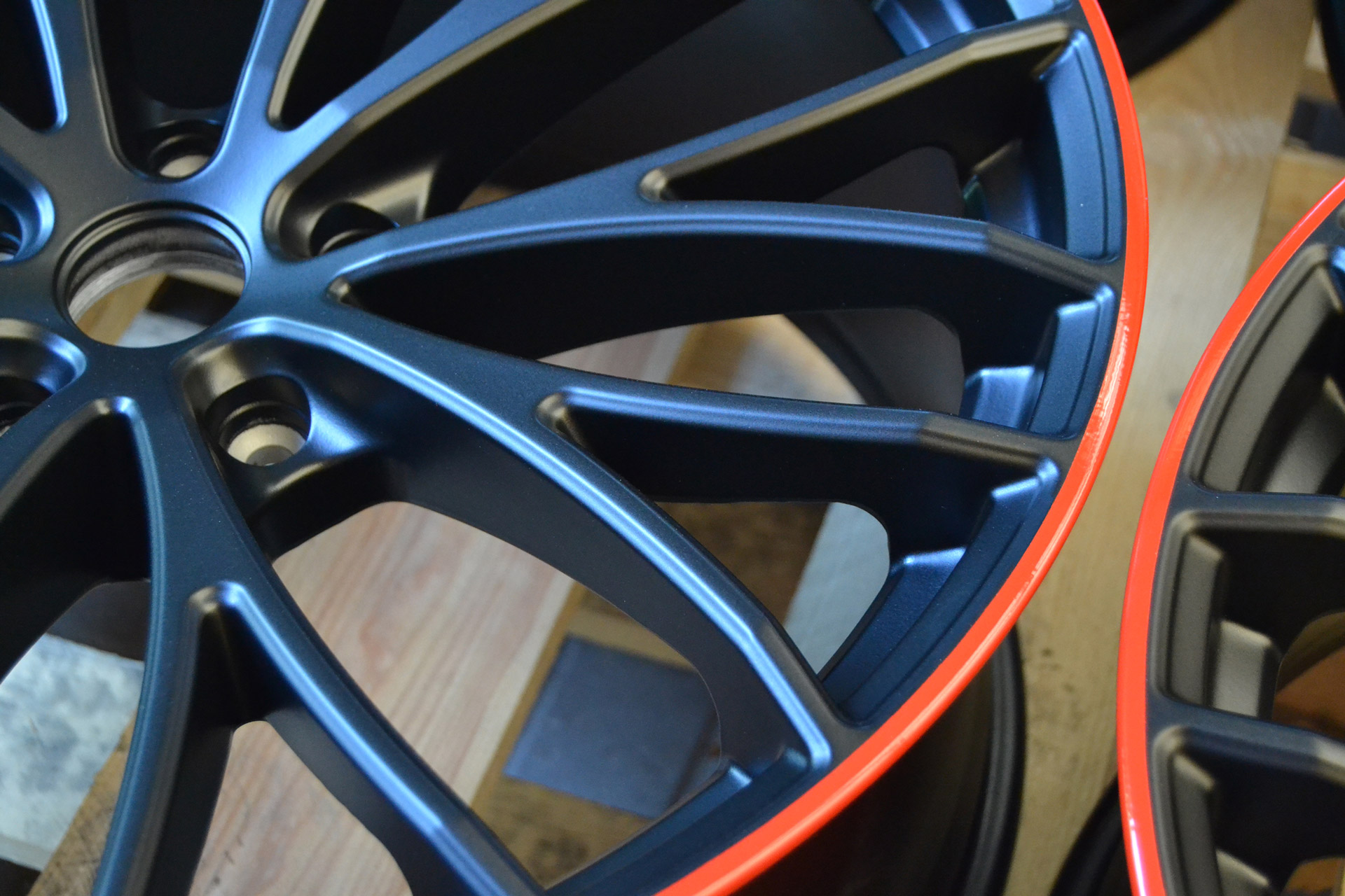 Nach dem Pulverbeschichten können die Teile auf Wunsch an bestimmten Stellen poliert werden und zum Schutz der polierten Flächen ergänzend Klar beschichtet werden (z.B. das Felgenbett wie es auf dem Bild unterhalb zu sehen ist).