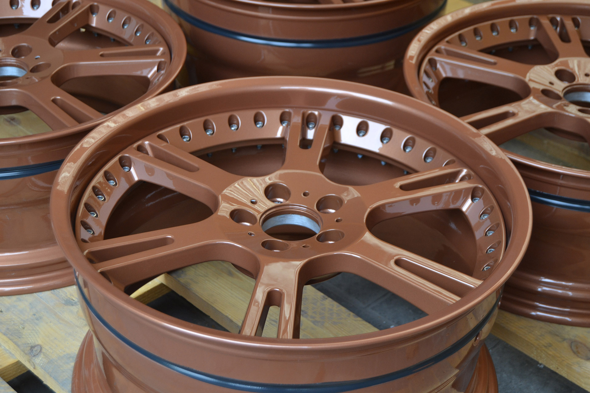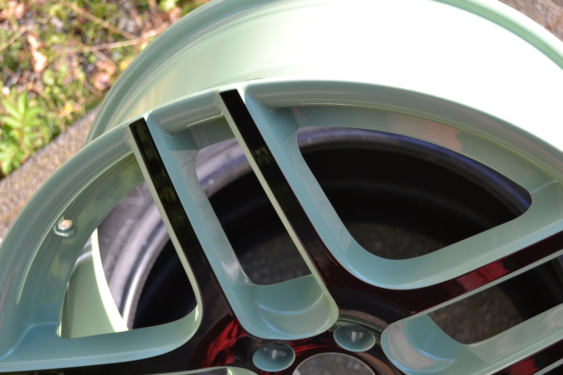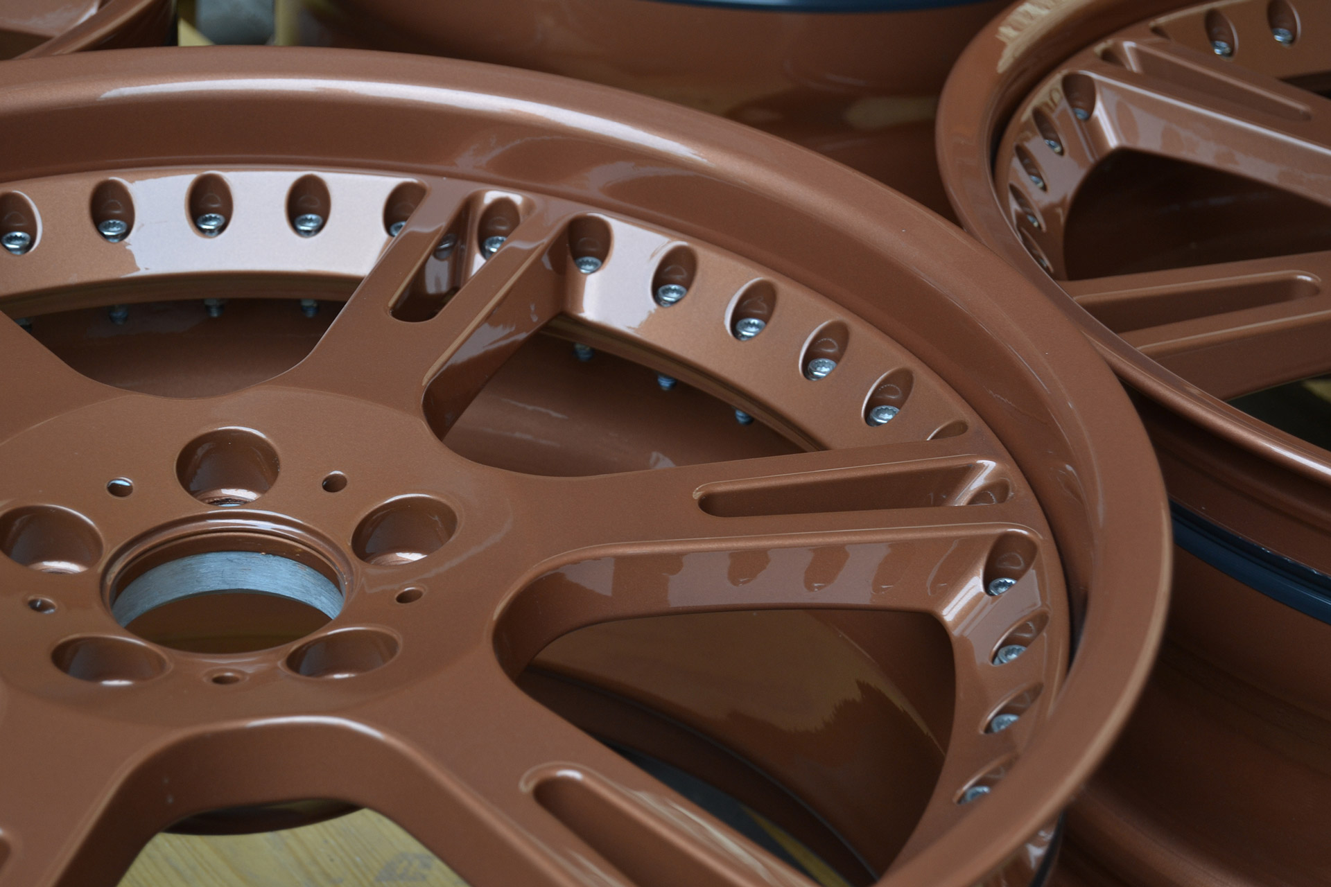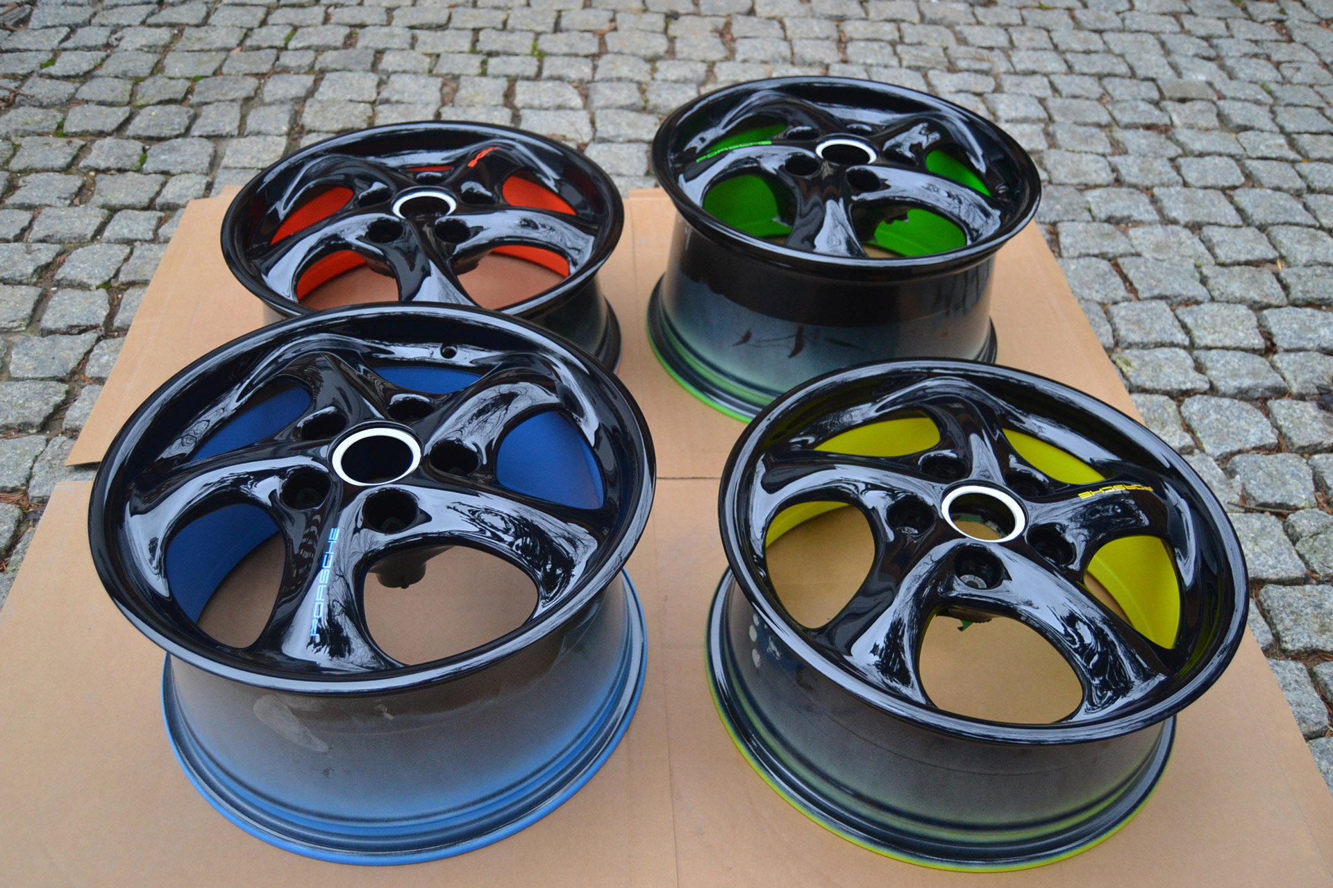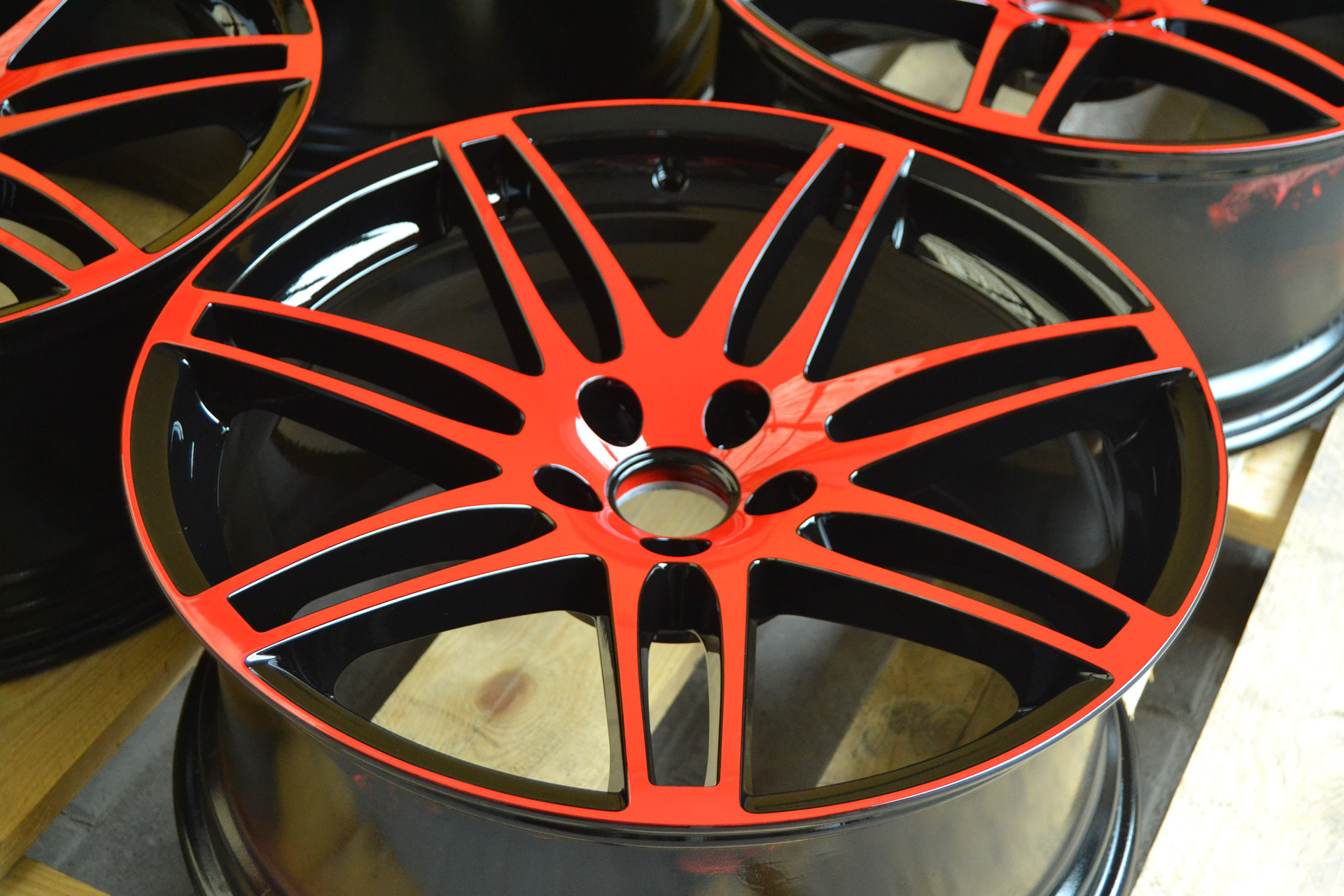 Nach dem Pulverbeschichten können die Teile auf Wunsch an bestimmten Stellen poliert werden und zum Schutz der polierten Flächen ergänzend Klar beschichtet werden (z.B. das Felgenbett wie es auf dem Bild unterhalb zu sehen ist).