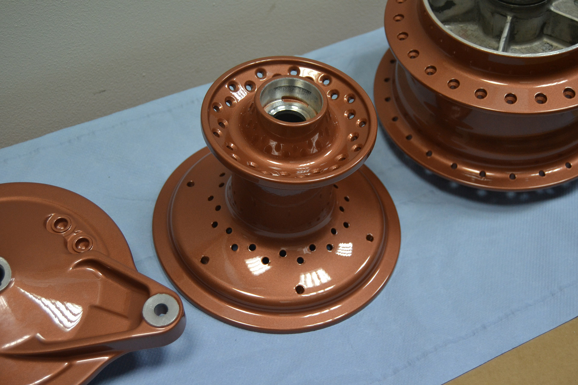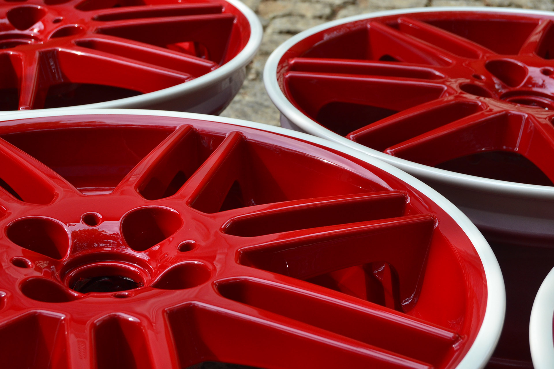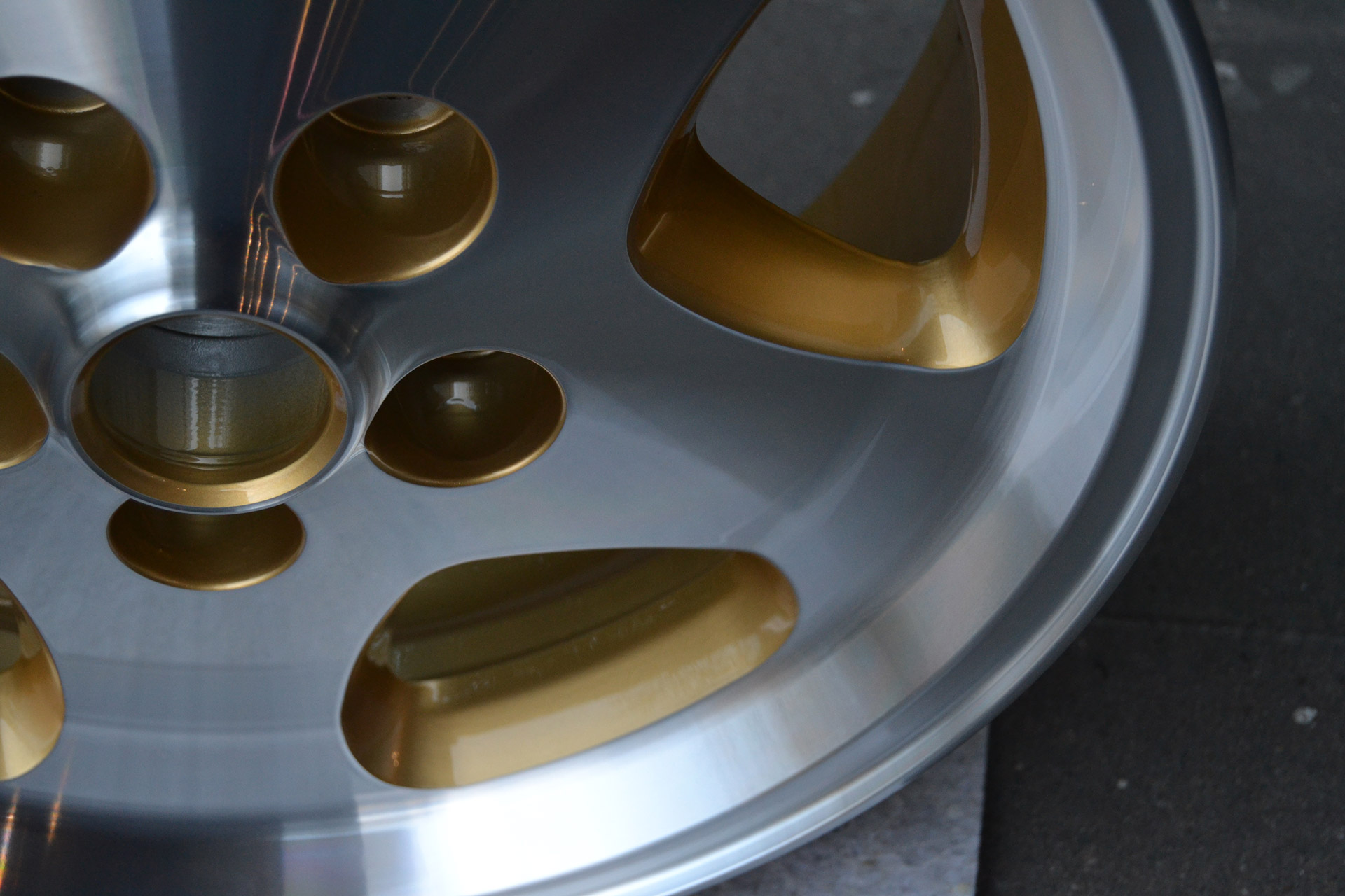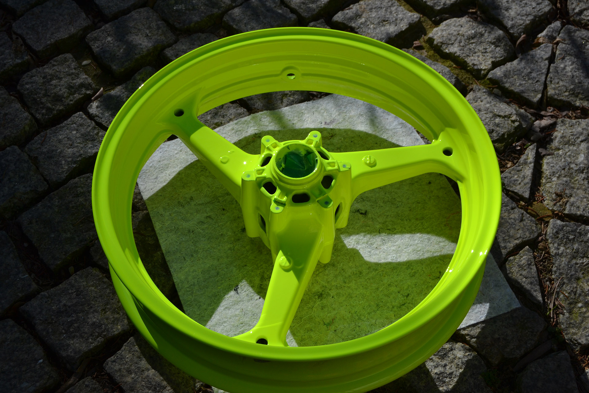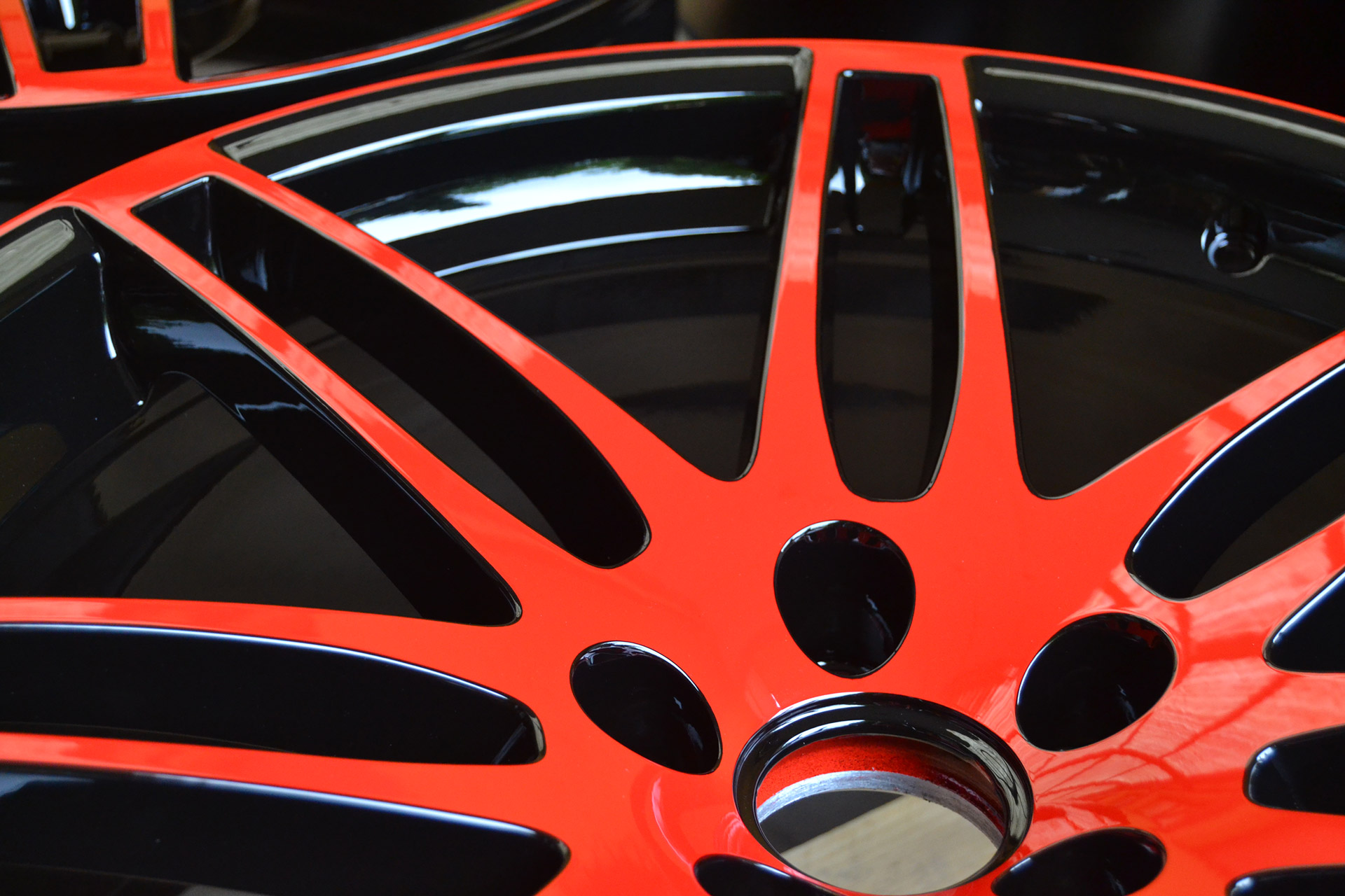 Nach dem Pulverbeschichten können die Teile auf Wunsch an bestimmten Stellen poliert werden und zum Schutz der polierten Flächen ergänzend Klar beschichtet werden (z.B. das Felgenbett wie es auf dem Bild unterhalb zu sehen ist).