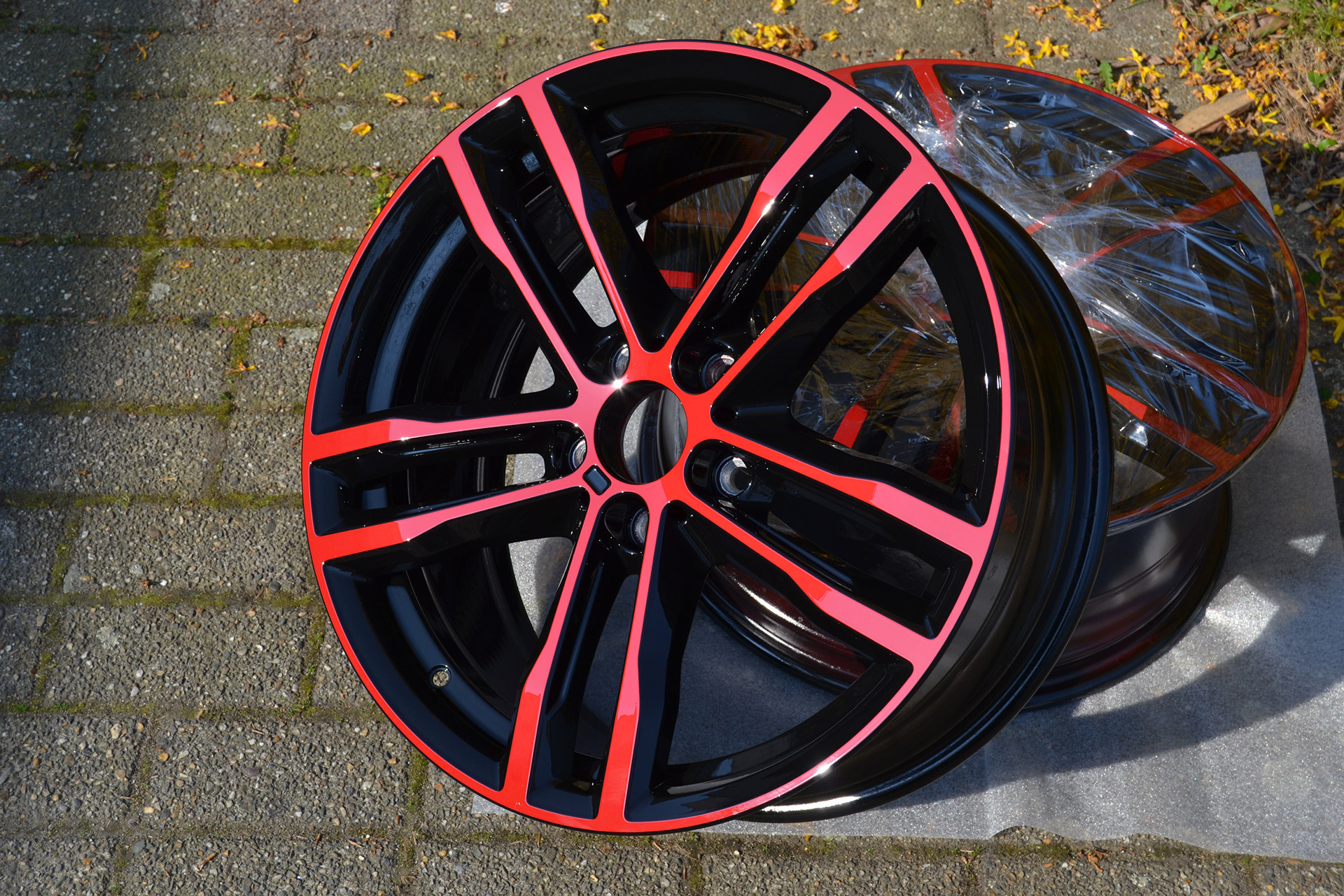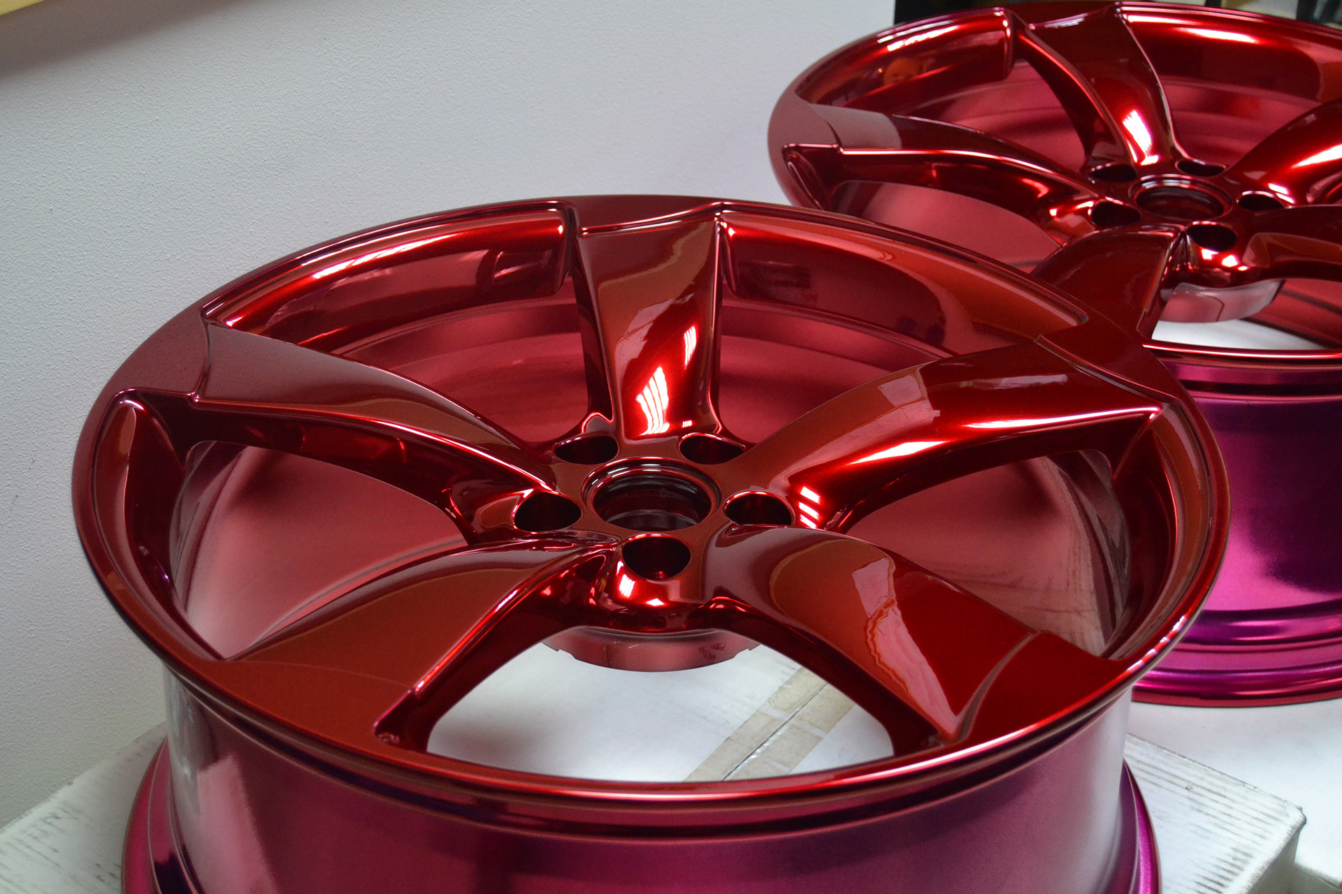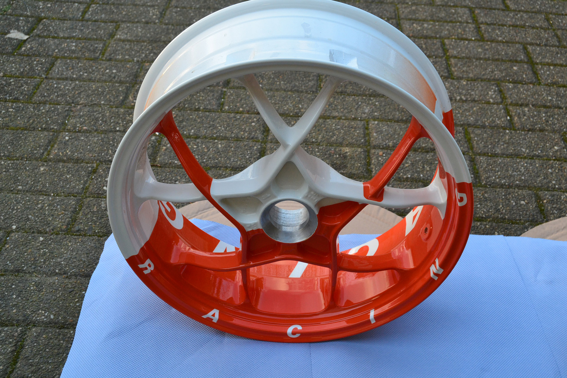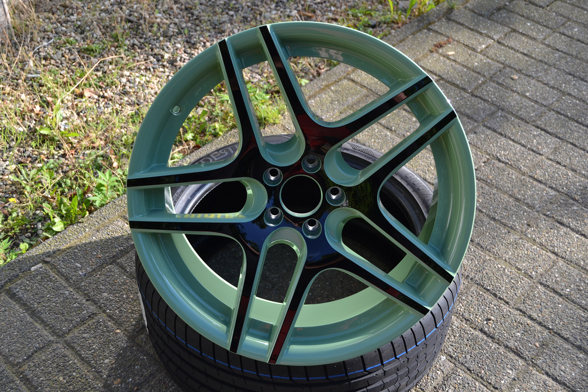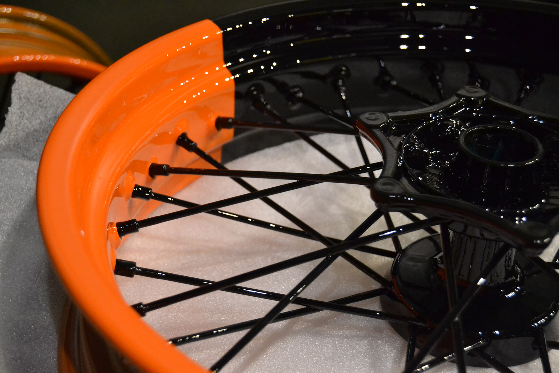 Nach dem Pulverbeschichten können die Teile auf Wunsch an bestimmten Stellen poliert werden und zum Schutz der polierten Flächen ergänzend Klar beschichtet werden (z.B. das Felgenbett wie es auf dem Bild unterhalb zu sehen ist).