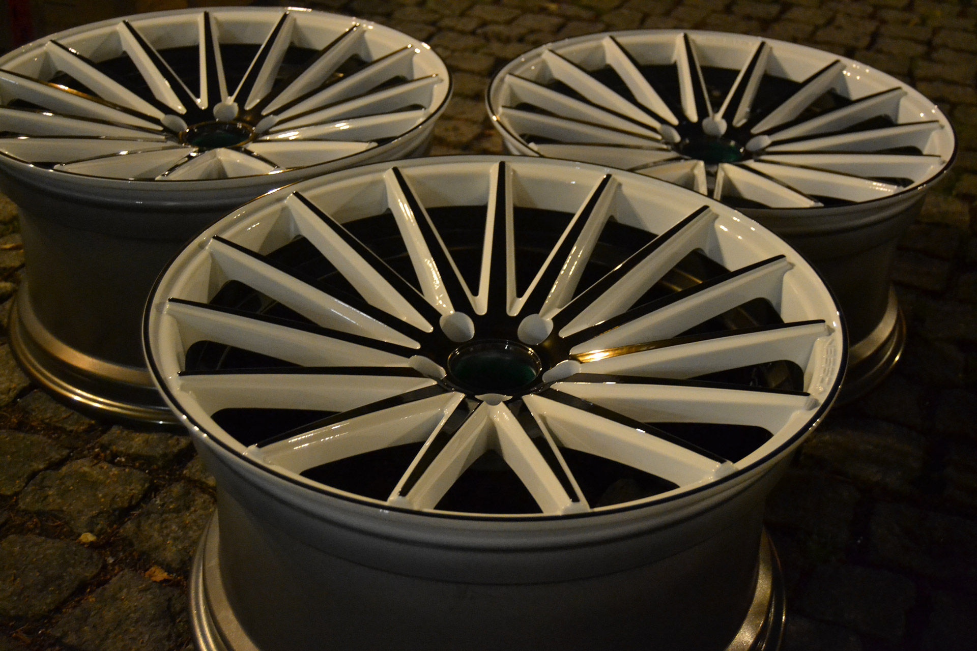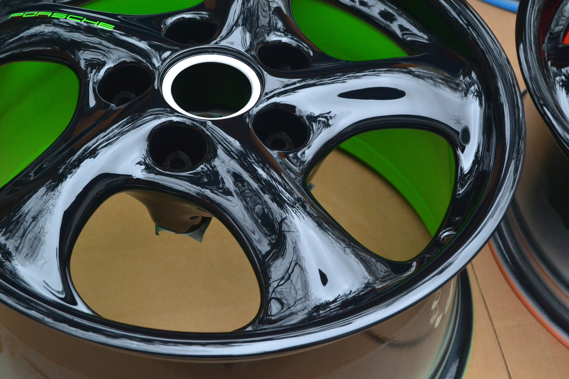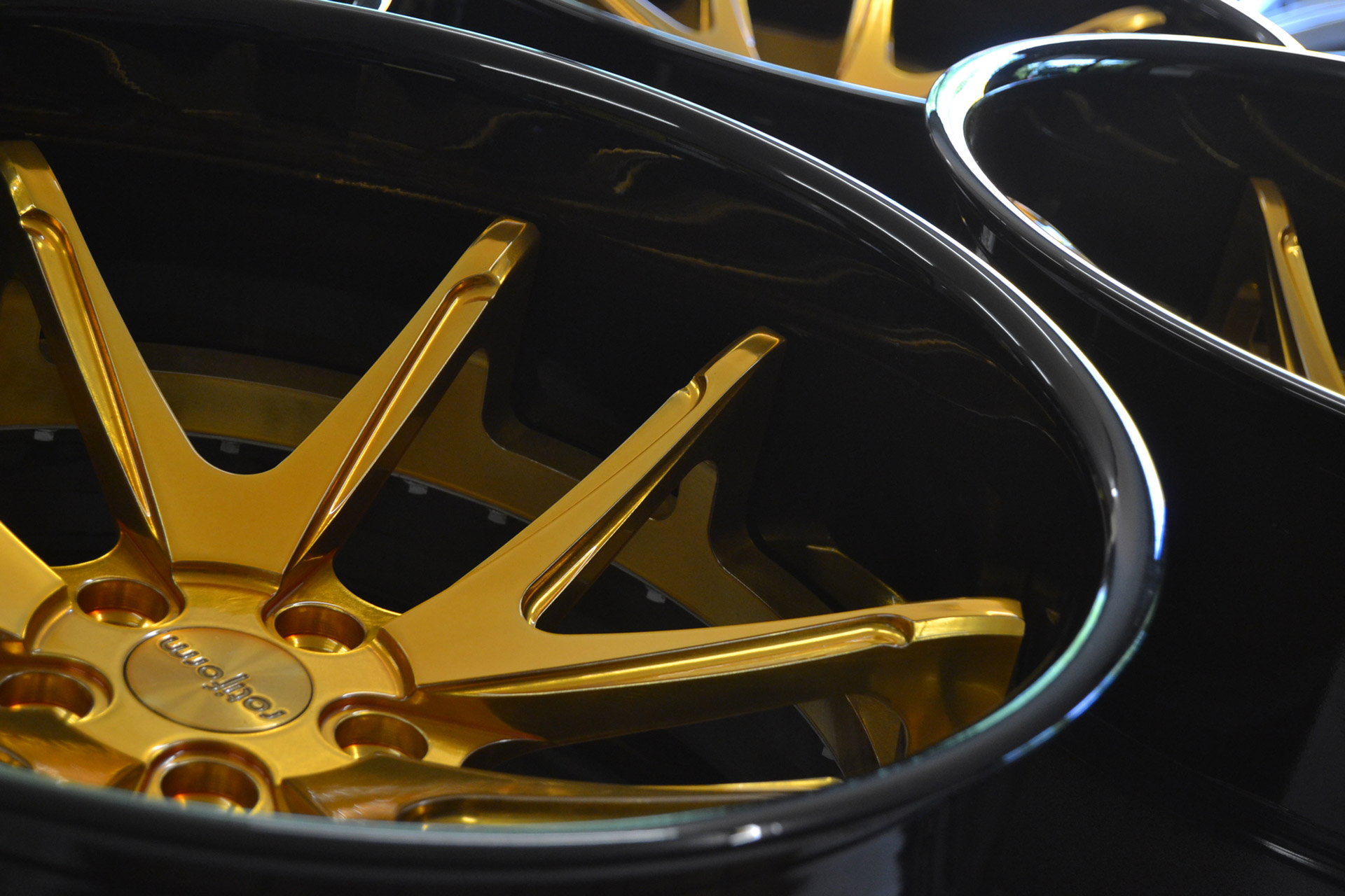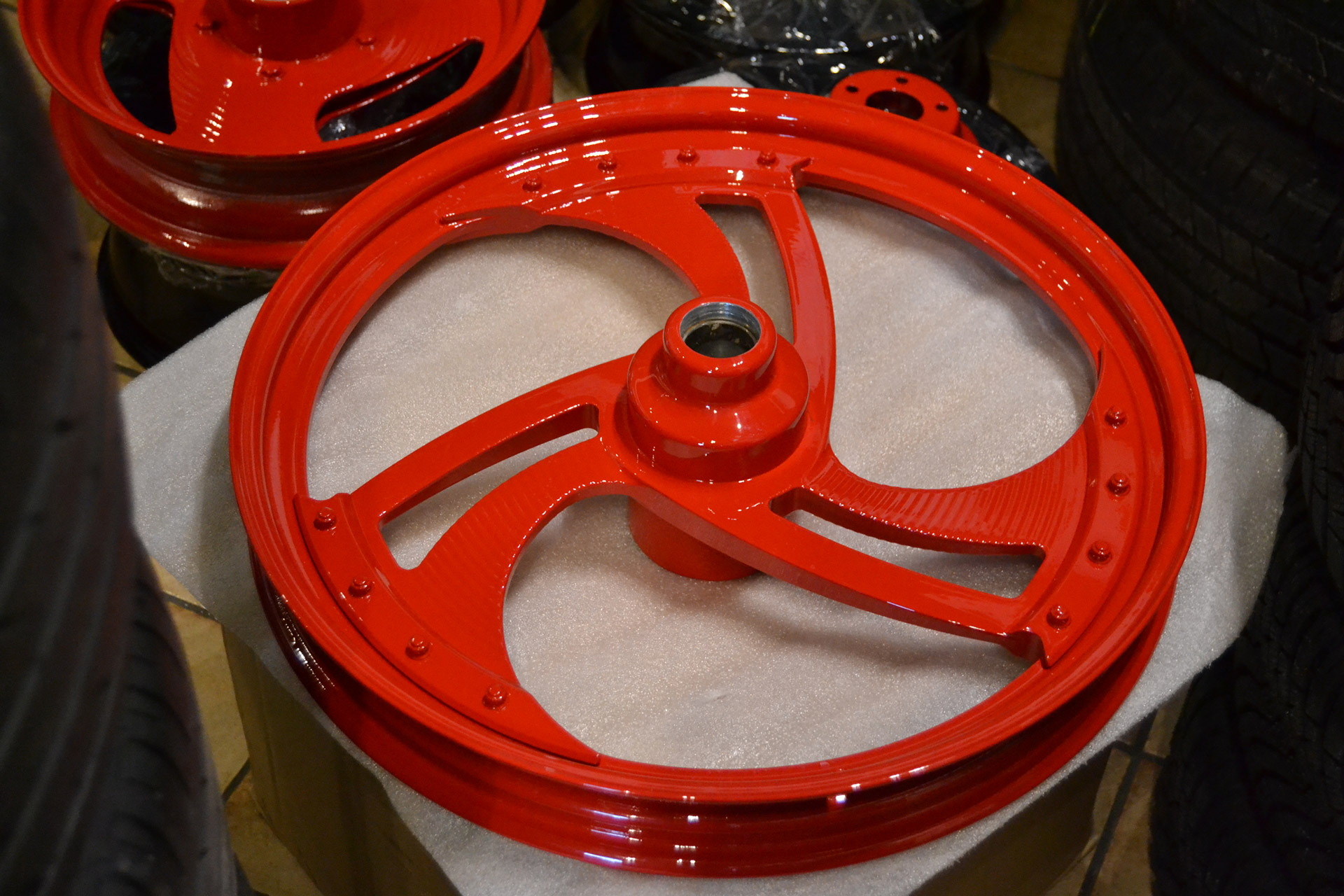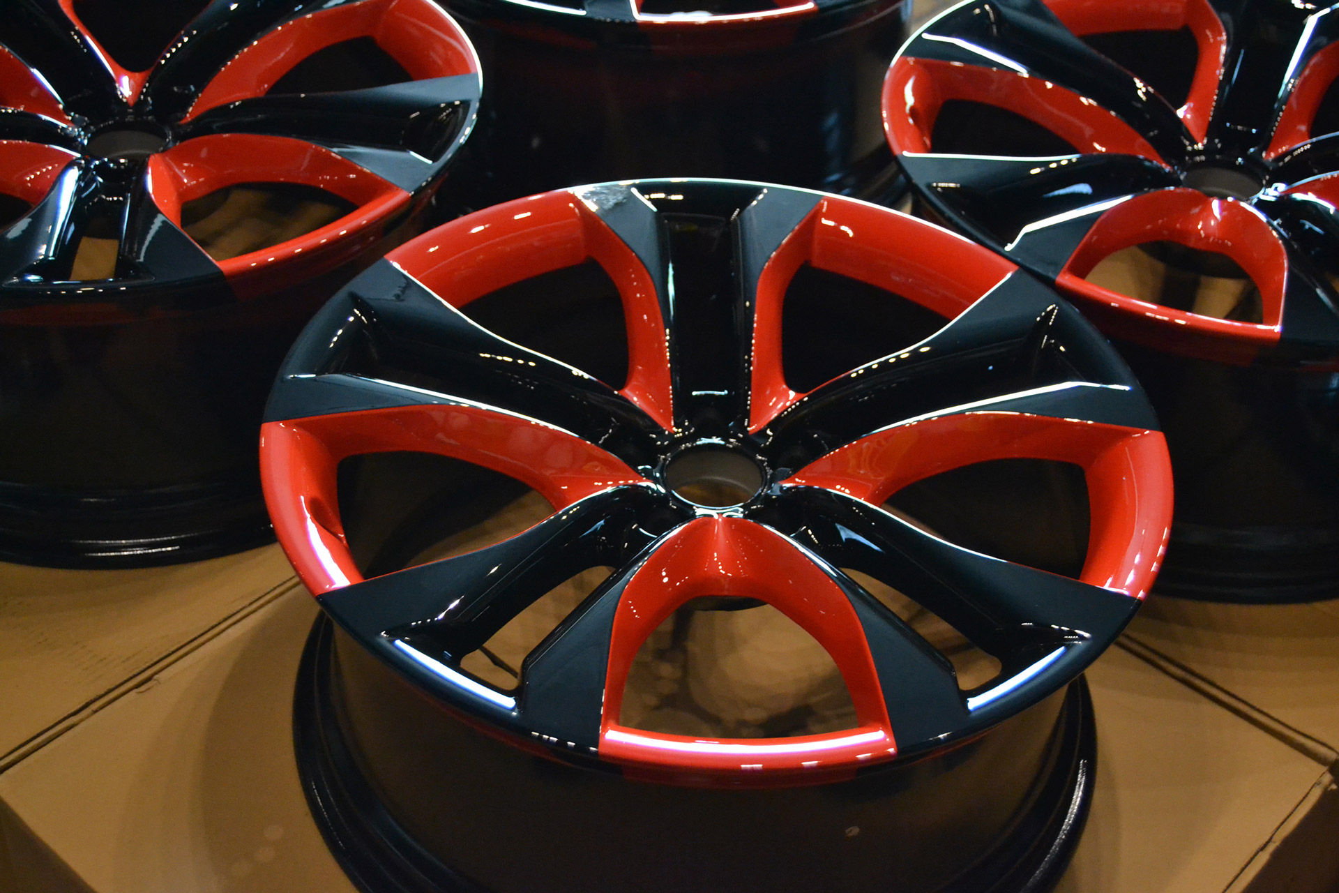 Nach dem Pulverbeschichten können die Teile auf Wunsch an bestimmten Stellen poliert werden und zum Schutz der polierten Flächen ergänzend Klar beschichtet werden (z.B. das Felgenbett wie es auf dem Bild unterhalb zu sehen ist).